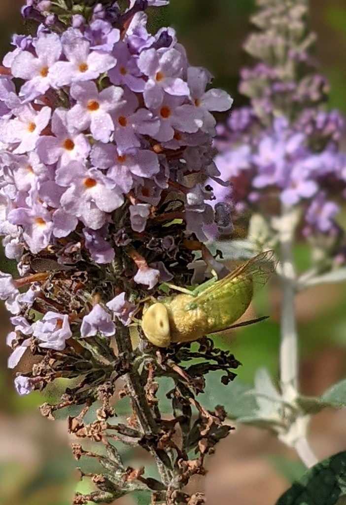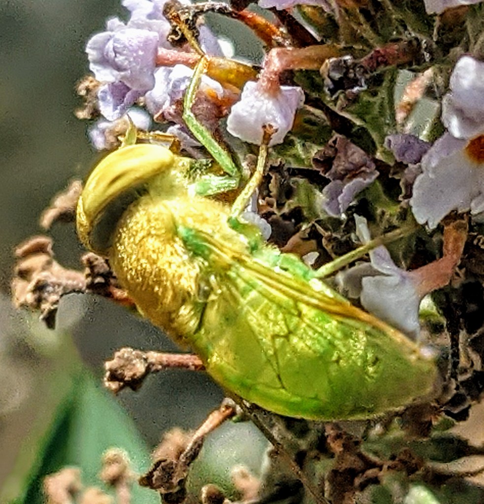 While enjoying the blooms of a buddleia I noticed this lovely bee on one of the flower clusters. The bright green of the bee and soft lavender of the flowers were a beautiful compliment to each other. And for once nature cooperated, the green bee sitting still while I fished out my phone to get some shots.