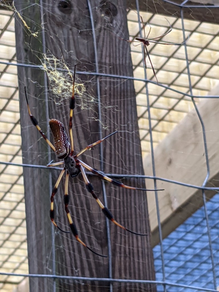 She was not alone. She was just the first one to catch a farmer in her web. Four webs had appeared seemingly overnight and now sieved mosquitoes out of the chicken coop. Each web held a massive female spider. Massive: about the size of a woman’s splayed hand. These are Golden Orb Weavers, often called banana spiders here in south Louisiana. They’re found around the globe in warm climates. Some are venomous but those found in the Americas, while able to bite, are not usually considered poisonous.