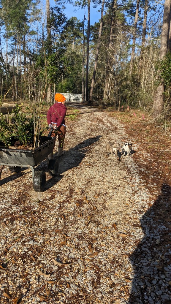 3. Plant food-producing trees. We have Autumn Brilliance serviceberry–a variety that can grow in our USDA zone, Persian and dwarf mulberry, native persimmon, low chill-hour apples, and about 200 new and replacement varieties of blueberries to meet our Conservation Stewardship Program requirements. We will also plant Mrs. GG Gerbing azaleas, Snow on the Mountain sasanquas, a Montezuma cypress, three Torrey Pines, and a sweet olive because it’s hard to imagine having too many beautiful trees, and beauty, after all, helps feed the soul.
